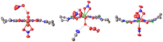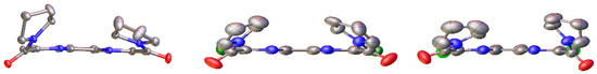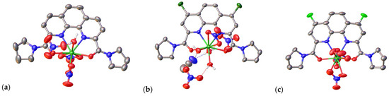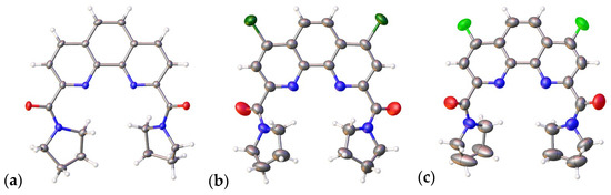 General view of ligands L1 (a), L2 (b), and L3 (c) in two projections. The non-hydrogen atoms are shown as thermal ellipsoids at a 50% probability level [16,17].