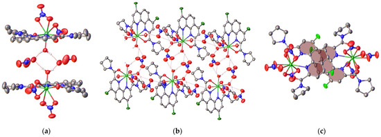 In L2•Lu(NO3)3, two nitrate anions occur in the outer sphere so that the metal ion coordinates one nitrate anion in a similar bidentate manner and three water molecules (Figure 3). The latter three molecules are involved in hydrogen bonding with the outer-sphere nitrate anions (O…O 2.72(2)–3.264(6) Å, OHO 126.3(3)–175.7(3)°) and the lattice acetonitrile molecule (O…N 2.853(6) Å, OHN 177.5(3)°) to produce corrugated double tapes along the crystallographic axis a (Figure 4). These tapes are packed into the 3D framework by Cl…Cl halogen bonds [26], as judged by the Cl…Cl distance of 3.251(2) Å and the C-Cl…Cl angle of 166.97(13)°, and stacking interactions between the parallel phenanthroline cores (the interplane angle is 0° and the intercentroid and shift distances are 4.6063(18) and 3.065(3) Å, respectively).