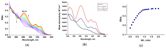Thus, these spectral changes can be used to determine stability constants (log β). Figure 5 shows an example of the absorption spectrum obtained by spectrophotometric titration of the ligand L3 with lanthanum trinitrate in a solution of dry acetonitrile (Figure 5a), the molar absorptions of free ligand L3 and Eu(III) complexes calculated from spectral deconvolution (Figure 5b), and the titration curve at maximum absorption (Figure 5c). Similar data for Nd(III), Eu(III), and Lu(III) are shown in Supplementary Materials Figure S7. All spectra have similar trends of change. With an increase in the number of metal ions added, the peak of the ligand L3 (~260 nm) gradually decreases, and a new peak corresponding to the metal-ligand complex appears in the 280 nm region. The obtained titration curves were analyzed using the Hypspec2014 program [30]. For all studied lanthanide ions, it was found that the titration data best correspond to the formation of L3:metal complexes 1:1 and 2:1 stoichiometry, which was previously also observed for L1 and L2 ligands [16,17]. The obtained stability constants of complexes of L3 with lanthanide ions (log β) are shown in Table 5. The L3 ligand has a greater affinity for light lanthanides since a decrease in log β1 is observed during the transition from La to Lu. It is worth noting that the stability constants for the L3 ligand with La3+, Nd3+, and Eu3+ are approximately 0.5 greater than the stability constants for the L1 and L2 ligands, while the log β1 values for complexes with Lu3+ are similar for all three ligands (log β1 = 5.98 ± 0.02 for L1 and 6.06 ± 0.02 for L2). The reason for this has been discussed above.