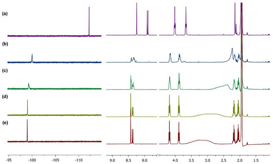 Next, we studied the complexation of L3 with lutetium trinitrate at 25 °C using 1H and 19F NMR titration in deuterated acetonitrile (Figure 6). The gradual addition of a solution of lutetium pentahydrate Lu(H2O)5(NO3)3 in CD3CN to a solution of L3 in the same solvent led to a downfield shift of phenanthroline H5,6 and H3,8 signals as well as signals of the α-CH2 groups of the pyrrolidine moieties. Adding two equimoles of lutetium trinitrate caused the H5,6 and H3,8 signals to shift by 0.18 and 0.46 ppm, respectively, and the signals of the α-CH2 groups to shift by 0.17 and 0.22 ppm. An especially significant shift was observed in the 19F NMR. For example, the starting ligand had a signal with a shift of −112.22 ppm, which decreased to −99.25 ppm and −98.95 ppm after the addition of one or two equimoles of lutetium trinitrate, respectively. At the same time, the spectrum continued to change slightly even with the addition of lutetium nitrate to the solution of the 1:1 stoichiometry complex. In the case of stoichiometry, clear signals are observed in both the 1H and 19F NMR spectra when the metal:ligand ratio is 2:1, which may indicate that in the case of 1:1 stoichiometry, the ligand molecules may not be equivalent [31].