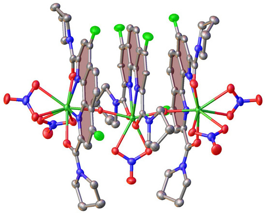 The coordination environment of the metal ion in L3•Lu(NO3)3 is formed only by the ligand L3 and three nitrate anions that all act as bidentate ligands. As a result, the coordination number reaches 10 (Figure 3). This type of coordination of the lutetium ion has already been observed in complexes with some organic ligands [27,28,29], however, it is still quite rare. For 1,10-phenanthroline-2,9-diamides, this is the first time that such a coordination number has been observed. As there are no convenient proton donors, such as the coordinated water molecules in L1•Lu(NO3)3 and L2•Lu(NO3)3, the crystal packing of L3•Lu(NO3)3 is dominated by parallel-displaced stacking interactions between the phenanthroline cores (the interplane angle is 0° and the intercentroid and shift distances are 4.217(5) and 2.507(8) Å, respectively) that produce centrosymmetric dimers (Figure 4).