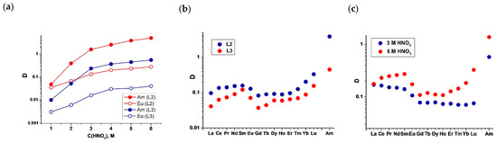 However, the introduction of electron σ-acceptor atoms (both chlorine and fluorine) into the positions four and seven of the phenanthroline fragment leads to a decrease in the Brønsted basicity of diamides for ligands L2 and L3. As a result, an increase in the distribution coefficients of Am(III) and Eu(III) is observed over the entire studied range of nitric acid concentrations (1–6 mol·L−1). Unsubstituted diamides usually have an extraction maximum at a nitric acid concentration of 3–4 mol·L−1. A higher acid content leads to ligand protonation and a decrease in the distribution coefficients [17,32].