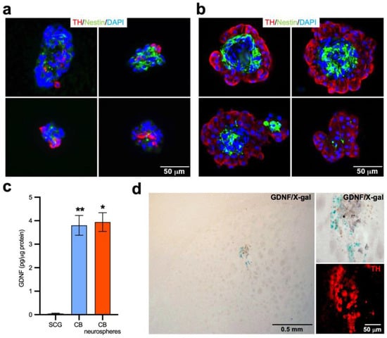 2.1. Histological Analysis and GDNF Expression of CB Stem-Cell-Derived Neurospheres
