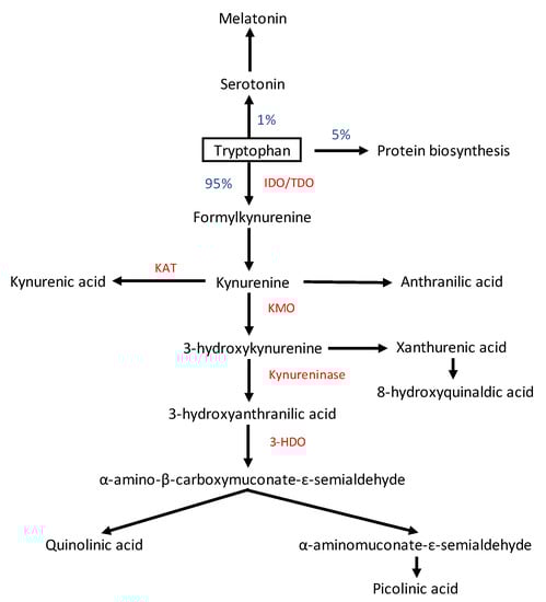 The KP is a metabolic pathway of the essential amino acid TRP degradation, and the pathway generates several neuroactive metabolites. Tryptophan is mainly obtained from protein-based foods and plays an important role in brain homeostasis as the precursor to serotonin (5-HT) neurotransmitters and melatonin hormone. In human and animal cells, the majority of TRP (95–99%) is converted to KYN and its metabolites through the KP, and only a small fraction of TRP is degraded through the 5-HT pathway []. The KP is upregulated in response to immune system activation, and produces various neuroactive metabolites that are able to influence the function on brain innate immune cells []. The first phase of TRP degradation via the KP is catalyzed by two main enzymes, tryptophan 2,3 dioxygenase (TDO) and indoleamine 2,3-dioxygenase (IDO) [,] (Figure 1). IDOs are primarily distributed in extrahepatic tissues, such as the brain, blood, kidney, and lung and the highest levels of TDO are expressed in the liver [,]. TDO is responsible for the regulation of systemic TRP concentrations, and its expression is activated by corticosteroids and glucagon. Meanwhile, IDO is stimulated by pro-inflammatory cytokines, such as interferon-gamma (IFN-γ), interleukin-1Beta, -6, (IL-1β, IL-6), tumor necrosis factor-alpha (TNF-α), and reactive oxygen species (ROS) during immune stimulation []. With aging, the activity of TDO in the brain decreases while the activity of IDO increases [,].