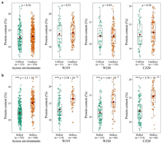 Comparison of protein contents between cultivars and landraces (a); hulled and hulless oats (b) across three environments and in individual environments. The central line of each box plot represents the median. The top and bottom edges of the box indicate the first and third quartiles, and the whiskers extend 1.5 times the interquartile range beyond the edges of the box. The red diamond indicates the mean value. A two-tailed Student’s t-test was used to generate the p values (*** p < 0.001).