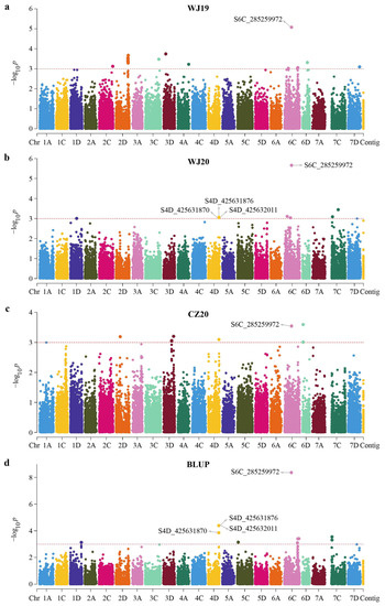 Manhattan plots of genome-wide association scan for oat groat protein content in the 174 diverse oat accessions in different environments using the mixed linear model (MLM) in TASSEL. Each dot represents an SNP. The horizontal dashed line represents the significant threshold −log10(p) equaling 3.0. The SNPs above the red dotted line are all significantly associated with the groat protein content. (a) WJ19, (b) WJ20, (c) CZ20, (d) multi-environment model. Names of significant markers detected in multiple environments are highlighted.