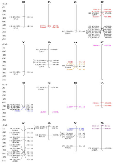 The chromosomal locations of previously reported QTLs [16,17,18,19,20] were determined by aligning the flanking markers to the “Sanfensan” reference genome. Of the 24 QTLs reported previously, 12 were located unambiguously on the chromosomes (Figure 4). A comparison of the loci identified in the present study with these known QTLs showed that two QTLs located on chromosomes 2D (QTL4) and 4A (QTL10) overlapped with the previously known QTLs. In addition, QTL11 on chromosome 4D (422.5–425.6 Mb) was located near a QTL on the TM_5 linkage group reported by De Koeyer et al. [17] (Figure 4).
