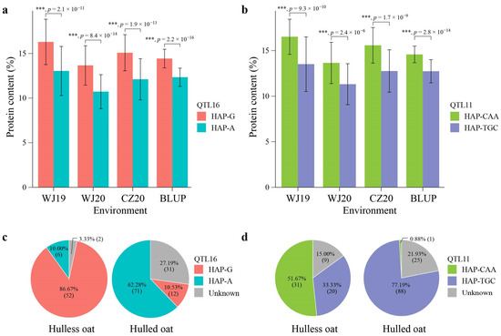 Genetic effects of bi-allele variation at QTL16 (a) and QTL11 (b) in relation to groat protein content in different environments, and allele frequencies of QTL16 (c) and QTL11 (d) in hulless and hulled oats. n = 77, with 64 independent oat accessions for HAP-G and HAP-A in a, and n = 108, 32 independent oat accessions for HAP-CAA and HAP-TGC in b, respectively. A two-tailed Student’s t-test was used to generate the p values (***, p < 0.001).