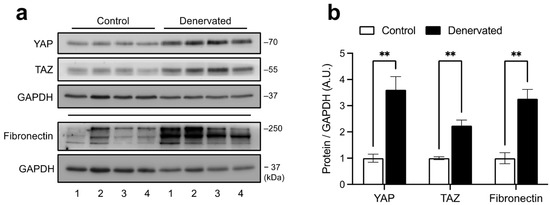 YAP/TAZ protein levels are increased in denervated skeletal muscles. (a) Western blot showing YAP/TAZ and fibronectin protein expressions in denervated and control (14 days post-denervation) TA muscles. Fibronectin and GAPDH were used as a fibrotic marker and loading control, respectively. For fibronectin, a second blot was carried out with the same samples. The numbers at the bottom indicate each independent mouse. (b) Densitometric analysis of YAP/TAZ and fibronectin signals normalized to their respective GAPDH. A.U. = arbitrary units. N = 4 independent mice. ** = p < 0.01; unpaired t test.