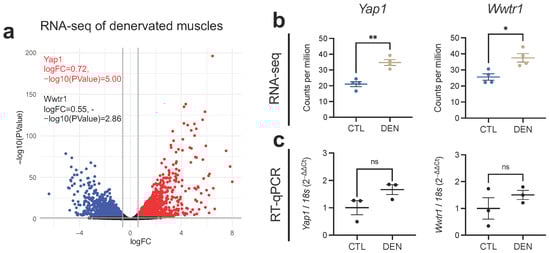 Yap1 and Wwtr1 mRNA levels are increased in denervated skeletal muscles. (a) Volcano plot showing differential expression analysis of RNA-seq data of denervated (DEN) vs. control (CTL) GST muscles. Values for Yap1 and Wwtr1 are highlighted. (b) RNA-seq analysis (counts per million of mapped reads) of Yap1 and Wwtr1 expressions from DEN and CTL muscles as in (a). N = 4 independent mice. * = p < 0.05, ** = p < 0.01; unpaired t test. (c) RT-qPCR analysis of Yap1 and Wwtr1 expression in DEN (14 days) and CTL soleus muscles. N = 3 independent mice. ns = not significant; unpaired t test.