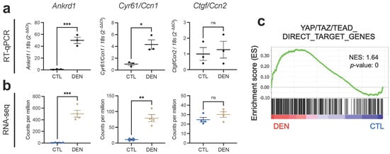 To assess whether increased expression of YAP/TAZ translates into increased transcriptional activity, we evaluated the gene expression of classical YAP/TAZ target genes, i.e., Ankrd1, Cyr61/Ccn1, and Ctgf/Ccn2. Fourteen days post-denervation, denervated muscles exhibited increased expression levels of Ankrd1 and Cyr61/Ccn1 compared to control muscles analyzed by RT-qPCR (Figure 3a). We did not find any changes in Ctgf/Ccn2 mRNA levels. Again, we complemented our RT-qPCR results with the RNA-seq data and found the same results (Figure 3b). Nevertheless, previous results from our lab showed increased CTGF/CCN2 protein levels, suggesting an earlier transcriptional upregulation [17]. These initial observations suggest that denervation triggers an active state of YAP/TAZ. Thus, we next decided to model transcriptional activity by gene set enrichment analysis (GSEA) using a defined set of YAP/TAZ/TEAD target genes previously reported [39]. GSEA works by ranking whole transcriptomic data in an ordered gene list based on differential expression analysis, from upregulated in denervation (DEN; red color) to upregulated in control (CTL; blue color) (bottom colored bar). Individual genes from the YAP/TAZ signature are scanned throughout the ranked list, and their positions are annotated (black lines above the colored bar). This analysis revealed that most of the target genes of YAP/TAZ fall within the upregulated genes of a denervated muscle obtaining a positive enrichment score (NES = 1.64, nominal p = 0), thus indicating increased transcriptional activity of YAP/TAZ under denervation (Figure 3c).