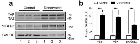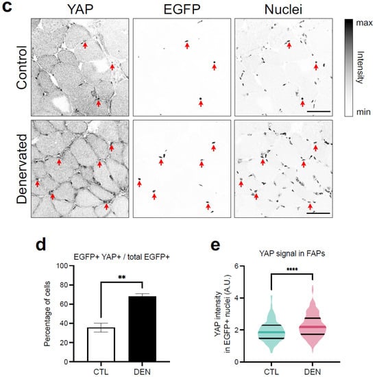 In the skeletal muscle, YAP/TAZ have been described as regulators of muscle stem cell (satellite cell) function and muscle mass [35,36]. Only one report has demonstrated that skeletal muscle denervation (by peroneal nerve transection) upregulates the expression of YAP in whole muscle and enhances its localization in myonuclei, a response related to the control of skeletal muscle atrophy [37]. The participation of other cell types residing in the skeletal muscle in the denervation process, such as FAPs, has not been addressed.