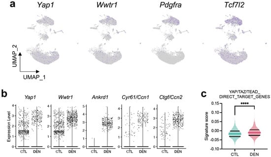snRNA-seq reveals muscle denervation is coupled with YAP/TAZ activation in FAPs. (a) Dimensionality reduction plot (UMAP) showing Yap1, Wwtr1, Pdgfra, and Tcf7l2 expressions from control skeletal muscles. (b) Violin plot showing Yap1, Wwtr1, Ankrd1, Cyr61/Ccn1, and Ctgf/Ccn2 expressions in FAPs from DEN (N = 3634 cells) and CTL (N = 3596 cells) GST muscles. (c) Signature score of YAP/TAZ/TEAD direct target genes in FAPs as in (b). **** = p < 0.0001; unpaired t test.