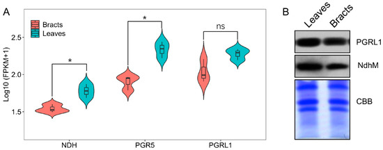 Transcriptome sequencing showed that the expression levels of PGR5 and NDH in leaves were significantly higher (p < 0.05) than those in bracts; however, the expression level of PGRL1 showed no significant difference between leaves and bracts (Figure 1A). Furthermore, the expression of NdhM (NdhM is a subunit of NDH complex, and the amount of its protein accumulation can reflect the activity of NDH-mediated cyclic electron flow) and PGR5 proteins in leaves were higher (p < 0.05) than in bracts (Figure 1B). These indicated both NDH- and PGR5-mediated CEF pathways in leaves and bracts, and these occupied a large proportion in leaves compared with bracts.