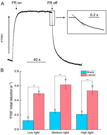 Effect of different light intensities on the initial reduction rate (0–0.2 s) of P700+ after turning off the far-red light (FR) in leaves and bracts, black rectangle reflects the initial reduction rate (0–0.2 s) of P700+ after turning off the far-red light as follows. (A) Dark reduction kinetics of P700+ with far-red light off (λ > 705 nm, 5.2 μmol m−2 s−1, lasted for 40 s); (B) P700+ initial reduction rate (0–0.2 s) under different PPFDs (400 μmol m−2 s−1, low light; 1800 μmol m−2 s−1, medium light; 2800 μmol m−2 s−1, high light). Different letters indicate a significant difference (p < 0.05) between the low, medium, and high light. ** denotes significance at the 0.01 level between the leaves and bracts based on an analysis of variance. Bars indicate SD (n = 3).