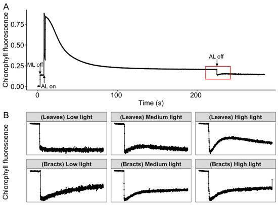Monitoring of NDH activity (red rectangle below (B)) using chlorophyll fluorescence analysis in cotton leaves and bracts (n = 3) under different light intensities of 400 μmol m−2 s−1 (low light), 1800 μmol m−2 s−1 (medium light), or 2800 μmol m−2 s−1 (high light). (A) Induction kinetics and post-illumination transient in chlorophyll fluorescence: AL (actinic light) (620 nm, 400 μmol m−2 s−1, 1800 μmol m−2 s−1, or 2800 μmol m−2 s−1, lasted for 4 min), ML (measuring light). (B) Analyses of post-illumination chlorophyll fluorescence transient in cotton leaves and bracts.