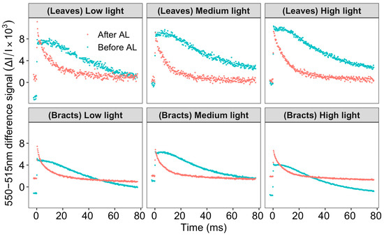 Changes in the P515 signal when a single-turnover saturating flash was applied to cotton leaves and bracts (n = 3) that had been given pre-illumination at different light intensities of 400 μmol m−2 s−1 (low light), 1800 μmol m−2 s−1 (medium light), or 2800 μmol m−2 s−1 (high light). After AL: the actinic light was turned on for 10 min, and then turned off, followed by dark adaptation for 4 min before measurement. Before AL: measurement of leaves and bracts after 1 h dark adaptation.