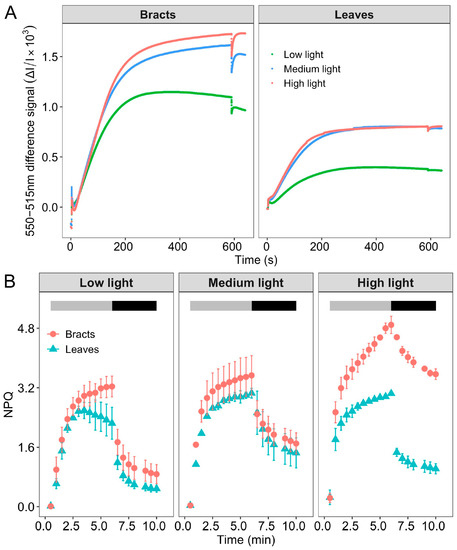 A Dual-PAM-100 chlorophyll fluorescence instrument (Walz Co., Effeltrich, Germany) was used to determine the chlorophyll fluorescence parameters. After the leaves and bracts were dark adapted for 30 min, the initial fluorescent (Fo) and the maximum fluorescent (Fm) were measured, then the actinic light (400 μmol m−2 s−1, 1800 μmol m−2 s−1, or 2800 μmol m−2 s−1) was turned on, and a saturating light pulse light (20,000 μmol m−1 s−1, the duration of saturated pulse Fm detection was 500 ms) was turned on every 30 s. After 6 min, the actinic light was turned off for 4 min to observe the recovery of NPQ in the dark. NPQ was calculated according to the formula (Fm − Fm’)/Fm’ [37].