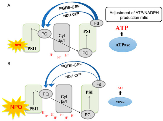 - Huang, W.; Yang, Y.J.; Zhang, S.B.; Liu, T. Cyclic electron flow around photosystem I promotes ATP synthesis possibly helping the rapid repair of photodamaged photosystem II at low light. Front. Plant Sci. 2018, 9, 239. [Google Scholar] [CrossRef] [PubMed]