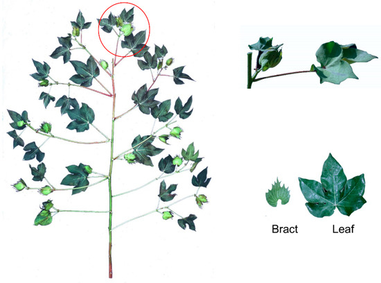 The experimental materials were sampled at the maturity stage, and the highest light intensity during the stage was 1500–2000 mol m−2 s−1. The first fully expanded leaves and the bracts corresponding to the first fruit node of each cotton plant were sampled, and three cotton plants were sampled in each plot. The sampling method is shown in Figure 7.