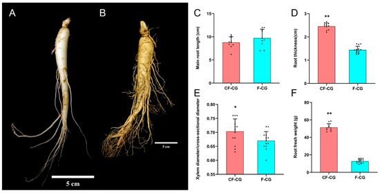 Growth and development of taproots of garden ginseng in different regions. (A): Garden ginseng cultivated in farmland (F-CG); (B): garden ginseng cultivated in deforested land (CF-CG), with the linear scale = 5 cm. (C): main root length; (D): main root thickness; (E): ratio of xylem diameter to cross-sectional diameter; (F): fresh weight of root (points in the figure represent individual values, and error bars represent standard errors; n = 12 (* p < 0.05; ** p > 0.01; the significance of the difference was analyzed using t-test).