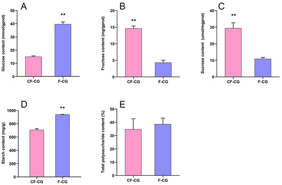 Determination of carbohydrate content in main roots of F-CG and CF-CG. (A): glucose; (B): fructose; (C): sucrose; (D): starch; (E): total polysaccharides (** p < 0.01; the significance of difference was analyzed using t-test; vertical bars indicate the mean value ± standard deviation from three independent experiments).