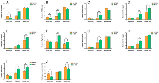 Determination of ginsenoside components in main roots of F-CG and CF-CG. (A): ginsenoside Rb1; (B): ginsenoside Rb2; (C): ginsenoside Rb3; (D): ginsenoside Rc; (E): ginsenoside Rd; (F): ginsenoside Rg1; G: ginsenoside Rg2; (H): ginsenoside Re; (I): ginsenoside Rf; (J): determination of total ginsenoside, etc. (* p < 0.05; ** p > 0.01; the significance of the difference was analyzed using t-test; vertical bars indicate the mean value ± standard deviation from three independent experiments).