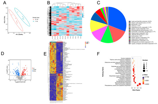 Basic metabolite information of F-CG and CF-CG based on non-targeted metabolomics. (A): Principal component analysis of the metabolites identified in F-CG and CF-CG. (B): Clustering analysis of F-CG and CF-CG samples. (C): A pie chart depicting the class of metabolites identified. (D): Volcano map showing differentially accumulated metabolites (DAMs) up-regulated, down-regulated or unchanged between F-CG and CF-CG samples. (E): Differential expression of DAMS between F-CG and CF-CG. (F): KEGG enrichment analysis of DAMs between F-CG and CF-CG.