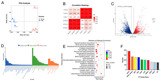 Basic genetic information of F-CG and CF-CG based on transcriptomics. (A): Principal component analysis of genes identified in F-CG and CF-CG. (B): Correlation analysis of F-CG and CF-CG samples. (Color indicates the level of correlation for each sample, from low (pink) to high (red), and Z score indicates the correlation coefficient between every two samples.) (C): Volcano plot showing differentially accumulated genes (DAGs) up-regulated, down-regulated or unchanged between F-CG and CF-CG samples. (D): GO enrichment analysis of DAGs for F-CG and CF-CG samples. (E): KEGG enrichment analysis of DAGs for F-CG and CF-CG samples. (F): A family of differentially expressed transcription factors in F-CG and CF-CG.