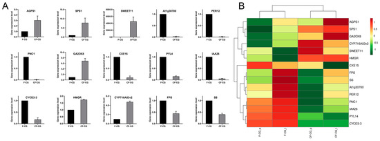 To validate the accuracy of our RNA-seq data, 15 genes possibly related to taproot enlargement in CF-CG, including genes encoding pathways related to starch and sucrose metabolism, phenylpropane biosynthesis, plant hormone signal transduction and ginsenoside biosynthesis, were examined using qRT-PCR (Figure 6A). A correlation analysis showed that the qRT-PCR results are consistent with the trend of RNA-seq expression levels (Figure 6B), indicating that the transcriptome data were reliable.