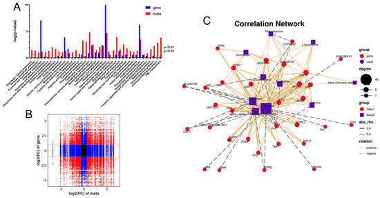 Correlation analysis of differential genes and differential metabolites in F-CG and CF-CG. (A): The nine-quadrant diagram shows the correlation of differential genes and differential accumulation metabolites between F-CG and CF-CG; (B): KEGG co-enrichment analysis of differential genes (blue column) and differential metabolites (red column); (C): correlation network diagram of differential genes and differential metabolites in pathways related to taproot enlargement in garden ginseng.