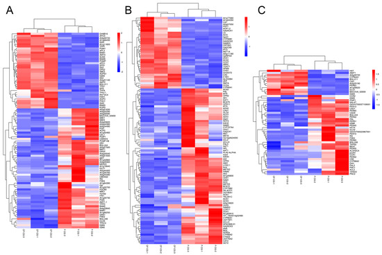 Heat map analysis of differentially expressed genes between CF-CG and F-CG. Red, up-regulated genes; blue, down-regulated genes. (A): Heat map analysis of differential genes in starch and sucrose metabolic pathways in F-CG and CF-CG. (B): Heat map analysis of differential genes in plant hormone biosynthesis and signal transduction pathways in F-CG and CF-CG. (C): Heat map analysis of differential genes in the phenylpropane metabolic pathways in F-CG and CF-CG.