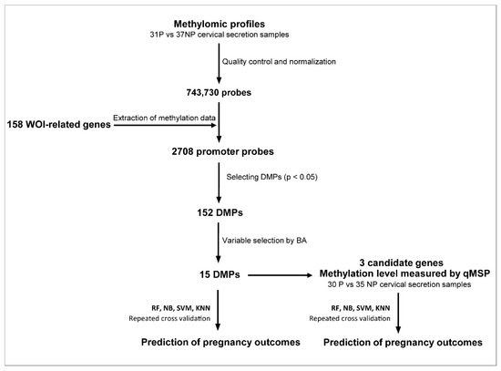 IVF: In vitro fertilization; ET: embryo transfer; COH: Controlled ovarian hyperstimulation; ML: Machine learning; WOI: Window of implantation; BA: Boruta algorithm; RF: Random forest; NB: Naïve Bayes; SVM: Support vector machine; KNN: K-nearest neighbors; ROC: Receiver operating characteristic; AUC: Area under the curve; qMSP: Quantitative methylation specific polymerase chain reaction; DNA: Deoxyribonucleic acid; BMIQ: Beta-Mixture Quantile; DMP: Differentially methylated probes; PPV: Positive predictive value; NPV: Negative predictive value; P: Pregnancy, NP: Nonpregnancy; POF: Premature ovarian failure; BMP2: Bone Morphogenetic Protein 2; CTSA: Cathepsin A; DEFB1: Defensin Beta 1; GRN: Granulin Precursor; MTF1: Metal Regulatory Transcription Factor 1; SERPINE1: Serpin Family E Member 1; SERPINE2: Serpin Family E Member 2; SFRP1: Secreted Frizzled Related Protein 1; STAT3: Signal Transducer And Activator Of Transcription 3; TAGLN2: Transgelin 2; TCF4: Transcription Factor 4; THBS1: Thrombospondin 1; ZBTB20: Zinc Finger And BTB Domain Containing 20; ZNF292: Zinc Finger Protein 292.