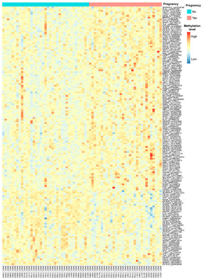 Statistical and ML analyses were conducted, and plots created, using SPSS Version 26.0 (IBM Corp., Armonk, NY, USA), and different packages implemented in R (version 4.1.1) [80]. Bivariate analyses were performed for all variables, including clinical characteristics and promoter probes, to test for differences between pregnancy and nonpregnancy sample groups. The chi-squared test or Fisher’s exact probability test were applied to categorical variables, and the nonparametric Mann–Whitney U test was applied to continuous variables. A p-value < 0.05 was considered statistically significant. We used the R pheatmap package to generate a heatmap to visualize the probes with methylation levels that differed significantly between the two sample groups [81].