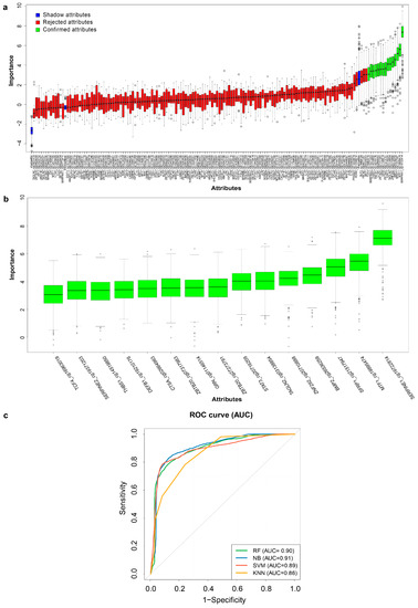 - Kursa, M.B.; Rudnicki, W.R. Feature Selection with the Boruta Package. J. Stat. Softw. 2010, 36, 1–13. [Google Scholar] [CrossRef]