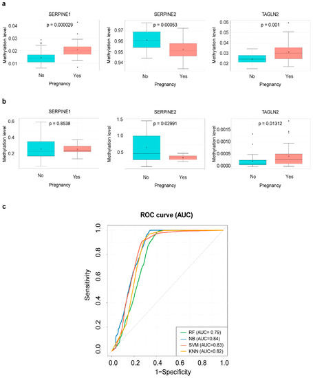 In the array sample set, the methylation level (β-value) of each gene promoter probe differed significantly between the two sample groups. SERPINE1 (cg19722814) and TAGLN2 (cg03138854) had higher methylation levels, whereas SERPINE2 (cg19371203) had a lower methylation level in pregnancy compared with nonpregnancy samples (Figure 4a). Predicting ongoing pregnancy in the array set using the DMP set with the best models via RF, NB, SVM, and KNN achieved accuracy rates of 73.15%, 74.32%, 73.68%, and 75.62%, respectively, and AUC values of 0.82, 0.84, 0.84, and 0.82, respectively (Supplementary Table S6, Supplementary Figure S4).