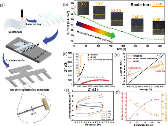 The preparation processes and some features of the planar graphene electrodes. (a) The illustration of the preparation process with an editable pattern; (b) the current measured during the preparation process (current density variation with time of exfoliation) and corresponding digital photos of the electrodes at certain exfoliation times; (c,d) the impedance spectra (c) and the I–V curves (d) of the graphite electrode and the graphene electrode with 240s exfoliation time, respectively, before and after activation; (e) the CV curves of the graphene electrodes prepared with different exfoliation times at 50 mV s−1 in 1M H2SO4 electrolyte (vs. Ag/AgCl 3 M); (f) the electroactive surface area and the exfoliation current for different exfoliation times obtained from (b,e), respectively.