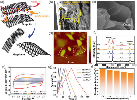 The detailed physiochemical properties of the prepared electrodes (especially G-240) and the energy storage abilities of G-240. (a) Illustration of the conversion from graphite to graphene during the electro-exfoliation process; (b,c) the respective cross-section (b) and high-resolution (c) SEM images of G-240; (d) the AFM image of the fakes from G-240; (e) the Raman spectra of the sets of graphene electrodes; (f) the CV curves of G-240 from the scan rates of 5 to 200 mV s−1 in the solution of 1M H2SO4 (vs. Ag/AgCl 3 M); (g,h) the charge–discharge curves and corresponding capacitance of G-240 at the current densities from 0.5 to 8 mA cm−2, respectively.