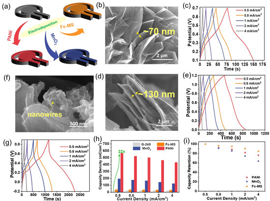 The preparation of the binary composites between G-240 and Fc-MS, MnO2, or PANI using electrodeposition methods. (a) The illustration of the composition between graphene and corresponding redox active materials; (b–g) the typical SEM images (b,d,f) and energy storage abilities (c,e,g) of G-240 functionalized with Fc-MS, MnO2, or PANI, respectively; (h,i) the calculated capacity density (h) and rate performance (i) of corresponding materials.