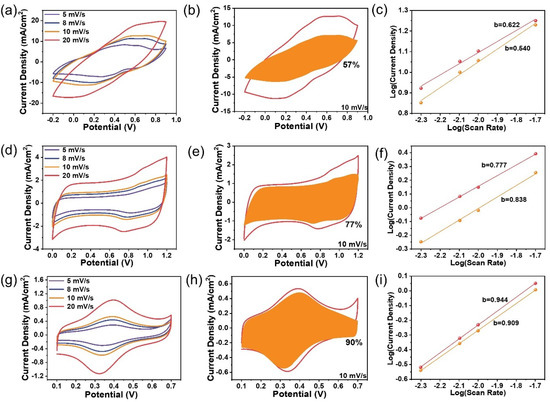 The kinetic analysis of the energy storage behaviors of Fc-MS, MnO2, and PANI: (a,d,g) the cyclic voltammetry of the three samples from 5 to 20 mV s−1; (b,e,h) the calculated surface-controlled current (the shaded area) from the respective CV curves (vs. Ag/AgCl 3 M); (c,f,i) the respective fitting slopes of the peak currents at different scan rates on a logarithmic scale.