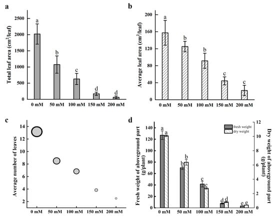 Nymphaea ‘Colorado’ water lily plants were treated with 0, 50, 100, 150, and 200 mM NaCl for 30 days. Symptoms of salt stress appeared in plants treated with 50 mM NaCl with severity increasing as the concentration of NaCl increased. Salt stress greatly inhibited the growth of water lily plants. The number of floating leaves decreased, with leaf chlorosis and decay after salt treatment. The images demonstrate a rapid reduction in biomass and the number of floating leaves in plants treated with as little as 50 mM NaCl. Decaying mature leaves and the regeneration of young floating leaves are clearly seen in plants treated with NaCl after 30 days of treatment (Figure 1). Leaf surface area, leaf number, and plant biomass were all negatively correlated with the concentration of NaCl after 30 days of continuous treatment (Figure 2). Quantification of the average leaf area, total leaf area, and average number of leaves confirmed that these parameters declined as the salt concentration increased (Figure 2a–c).