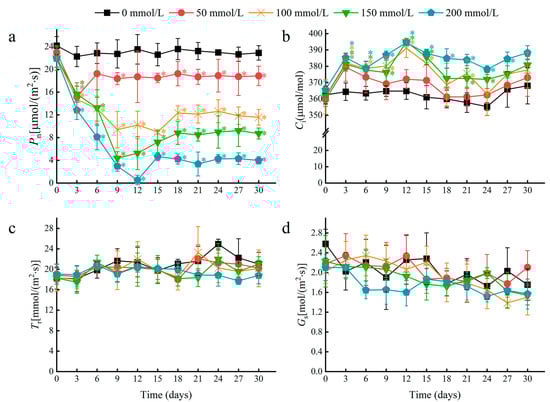 Multiple photosynthetic parameters were recorded at three-day intervals over a 30-day period in plants treated with 0, 50, 100, 150, and 200 mM NaCl. A rapid decline in the leaf net photosynthetic rate (Pn) occurred by day 3 for all treatments, and the decline was greater with increasing salt concentration (Figure 3a). After 30 days, the 50 and 100 mM NaCl treatments resulted in a Pn decrease of 17.69% and 49.49%, respectively, relative to the control. At higher concentrations of 150 and 200 mM NaCl, Pn decreased by 62.01% and 82.62%, respectively, relative to the negative control. Notably, the Pn stabilized after day 6 for plants treated with 50 mM NaCl. This stabilization effect was also observed at higher salt concentrations but occurred after 12 to 15 days, and the stabilized Pn values were reduced by approximately 50% or more compared to the negative control. This stabilization in the Pn suggests that water lilies can tolerate photosynthetic damages caused by salt stress, and indicates that increased photosynthetic damage likely occurs when plants are subjected to salt concentrations greater than 50 mM NaCl.