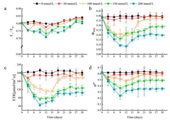 The effects of salt stress on chlorophyll fluorescence parameters in water lily plants. (a) Maximum quantum efficiency of photosystem II (PSII) (Fv/Fm), (b) actual photochemical quantum yield of PSII (ΦPSII), (c) electron transport rate (ETR), and (d) photo-chemical quenching coefficient (qP) in water lily plants subjected to salt stress over 30 days. Data are the means of ten biological replicates (±SDs). The asterisks represent statistically significant differences (p < 0.05).