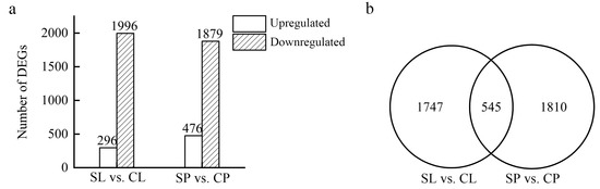 Differentially expressed genes (DEGs) were identified using DEseq by comparing the transcriptomes of the leaves and petioles collected from salt-treated plants to a non-treated control. A total of 2292 and 2355 DEGs were identified in the leaves and petioles, respectively, of water lilies treated with 150 mM NaCl. Of the DEGs, 296 were upregulated in young floating leaves, and 1996 were downregulated. In the petioles, 476 genes were upregulated, and 1879 were downregulated (Figure 5a). Floating leaves and petioles subjected to 150 mM NaCl shared 545 DEGs, whereas 1747 DEGs were leaf-specific, and 1810 DEGs were petiole-specific (Figure 5b).