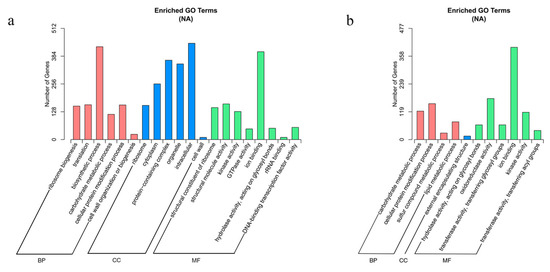Enriched GO terms based on DEGs identified in leaves and petioles under salt treatment. (a) Enriched GO terms in leaves. (b) Enriched GO terms in petioles.
