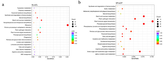 Enriched KEGG pathways based on DEGs identified in leaves and petioles under salt treatment. (a) Enriched KEGG pathways in leaves. (b) Enriched KEGG pathways in petioles. padj, adjusted p-value. Pathways that have a p-value under a threshold of 0.05 were identified as significantly enriched pathways, and marked with a circle. Pathways in a triangle have a p-value above 0.05.