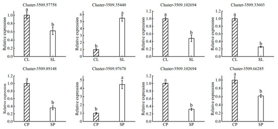 To validate RNA-seq data, ion-transport-related genes Cluster−3509.57758, Cluster−3509.35440, Cluster−3509.102694, Cluster−3509.89148, and Cluster−3509.97678, and auxin-related genes Cluster−3509.33603 and Cluster−3509.66285 were used as candidate genes. The total RNA was extracted using a FastPure Universal Plant Total RNA Isolation Kit (Vazyme, Nanjing, China). The cDNA was synthesized using a HiScript® II Q RT SuperMix for qPCR (+gDNA wiper) synthesis kit (Vazyme, China). RT-PCR was performed on BIO-RAD CFX-Opus 96 (Bio-Rad, Hercules, CA, USA) using ChamQ Universal SYBR qPCR Master Mix (Vazyme, China) [3]. Three biological replicates were analyzed and actin was used for normalization.