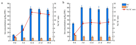 Water lily petioles and floating leaves were sampled at 0, 3, 12, 21, and 30 days after treatment with 150 mM of NaCl. Fresh samples were dried to a constant weight. For ICP-MS analysis, the samples were digested with a mixture of nitric acid and H2O2 and examined for sodium (Na) and potassium (K) contents using an inductively coupled plasma mass spectrometer (ICP-MS; Agilent Technologies Co., Ltd., Santa Clara, CA, USA) [55].
