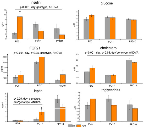Hormonal and metabolic characteristics of females during pregnancy and lactation: * p < 0.05; post hoc Newman–Keuls test between a/a and Ay/a; PD5,17—pregnancy day 5, 17; PPD10—postpartum day 10. Data are presented as mean ± SE for 7 mice in each group. Data were analyzed with two-way ANOVA with factors “day” (PD5, PD17, and PPD10) and “genotype” (a/a and Ay/a).