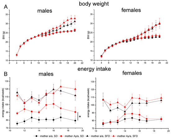 Influence of maternal obesity on body weight (A) and weekly energy intake (B) in male and female offspring consuming SD or SFD diets. Male and female offspring of obese (Ay/a) and control (a/a) mothers were fed with SD or SFD for 10 weeks from the age of 10 weeks. Data are presented as mean ± SE. The number of animals in groups is shown in Table 2. Data were analyzed by repeated measures ANOVA with factors “sex”, “diet” and “maternal genotype (MG)” for all groups and separately for males and females that consumed different diets with factor “MG”: * p < 0.05; MG, repeated measures ANOVA for SD-males. Axis X designates mouse age (weeks).